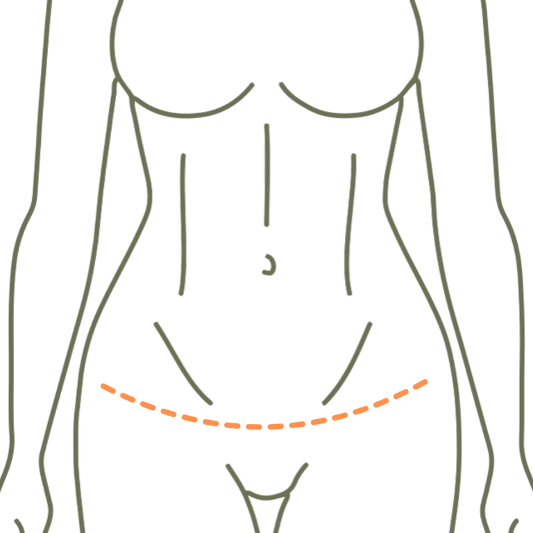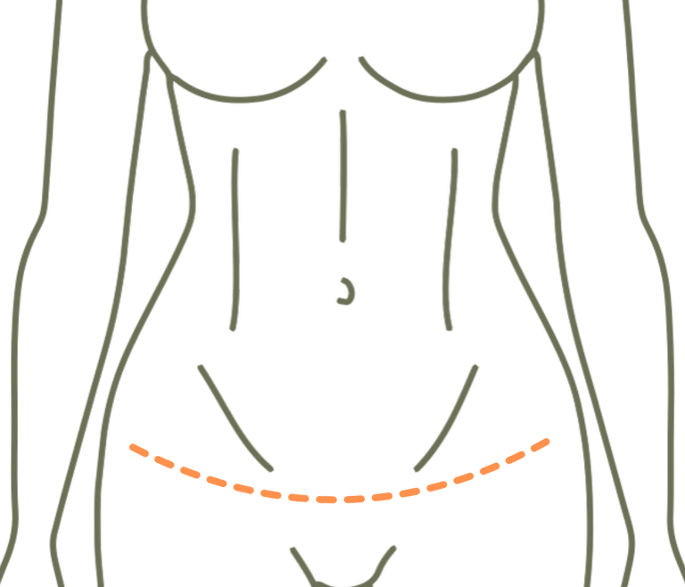 Incisão baixa e discreta, posicionada para ficar escondida sob a roupa íntima.